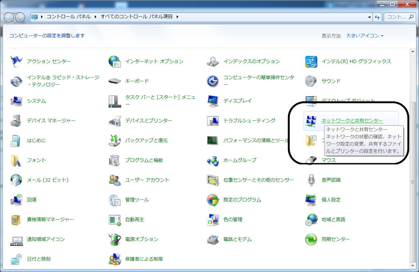 1:コントロールパネルから『ネットワークと共有センター』を開きます。