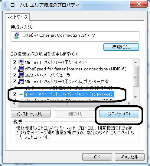 4:『インターネット プロトコル バージョン 4 (TCP/IPv4)』をクリックして、次に『プロパティ(R)』をクリックします。