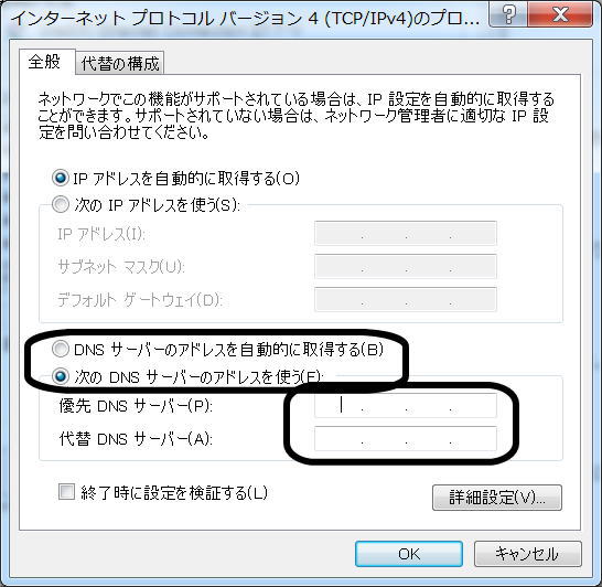 ※ここで、既に選択されており、優先DNSサーバや代替DNSサーバーの項目に数字が入力されている場合は、入力されている文字を忘れない様に控えてください。もし、回復しなかった場合に元に戻す必要があります。また、既に入力されている方は、上の『DNSサーバーのアドレスを自動的に取得する(B)』を選択してください。