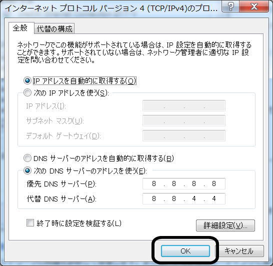 『優先DNSサーバー(P):』に[ 8.8.8.8 ]と入力します。